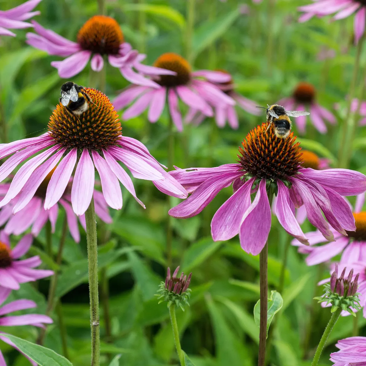 Jeżówka Purpurowa echinacea purpurea – oferuje duże i efektowne różowo-fioletowe kwiaty z wyraźnymi miedzianymi środkami umiejscowione na sztywnych łodygach. Wieloletnia bylina długo kwitnąca, od końca czerwca aż do września produkuje liczne kwiatostany. Jest wytrzymała i nie wymaga palikowania i stanowi doskonały kwiat cięty. Pochodzi z części wschodniej Ameryki Północnej, występując w krajobrazach prerii.