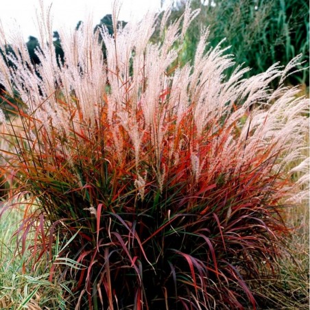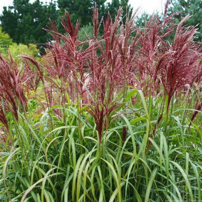 Kwiatostany: wiechy ciemnoczerwone → później beżowo‑srebrzyste, dekoracyjne do zimy.