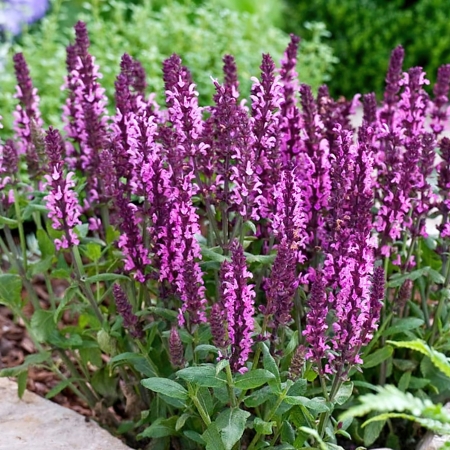 Niska, bardzo zwarta szałwia omszona o intensywnie różowych/magenta kłosach, często z ciemniejszymi podsadkami, które podbijają kolor kwiatów. Odmiana idealna na słoneczne obwódki i do pojemników – tworzy gęste kępy i powtarza kwitnienie po przycięciu. Najczęściej osiąga 20–30 cm wysokości i około 30 cm szerokości.