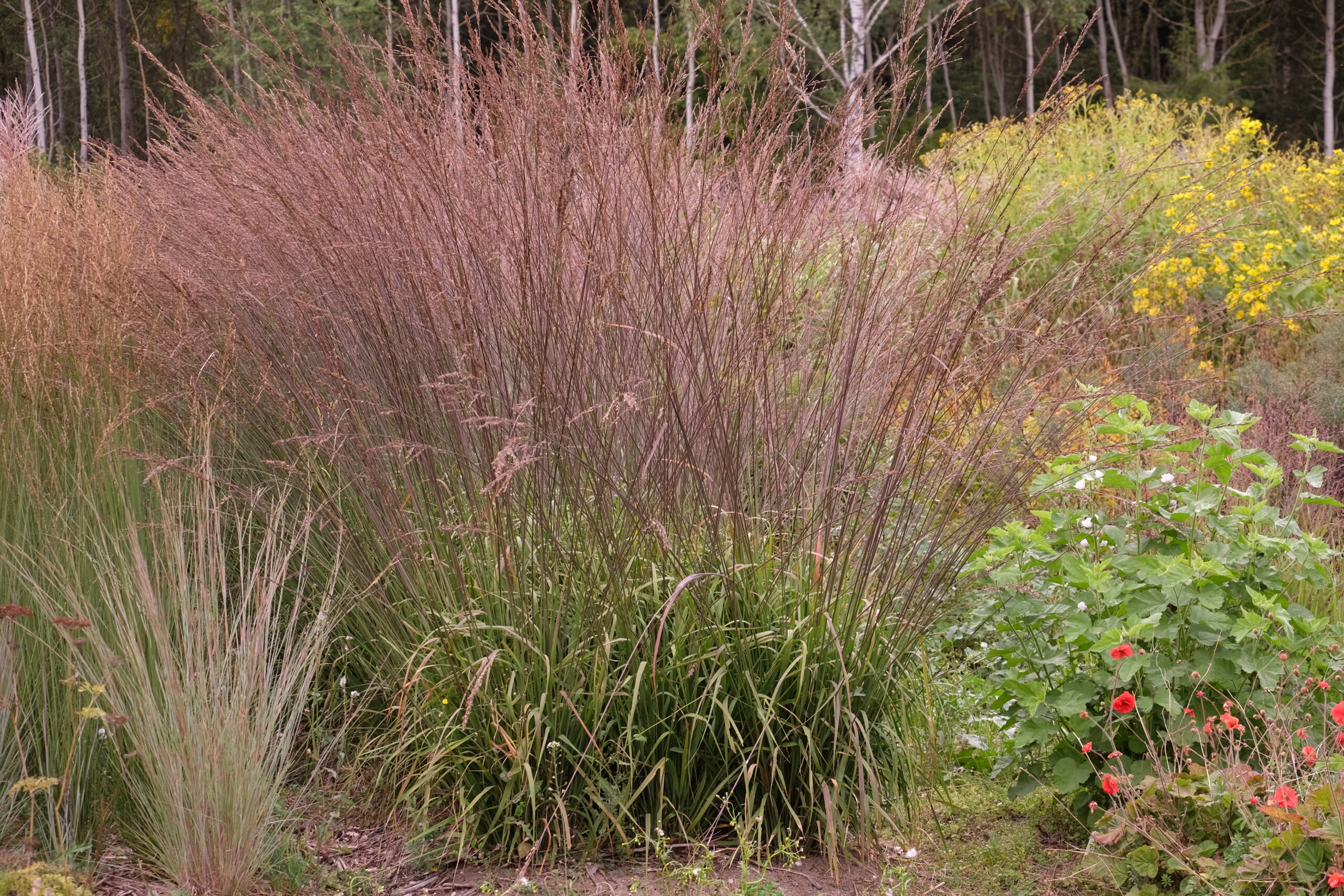 Tło dla niższych roślin – ciemne, strzeliste źdźbła pięknie eksponują jasne kwiaty sąsiednich gatunków.