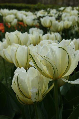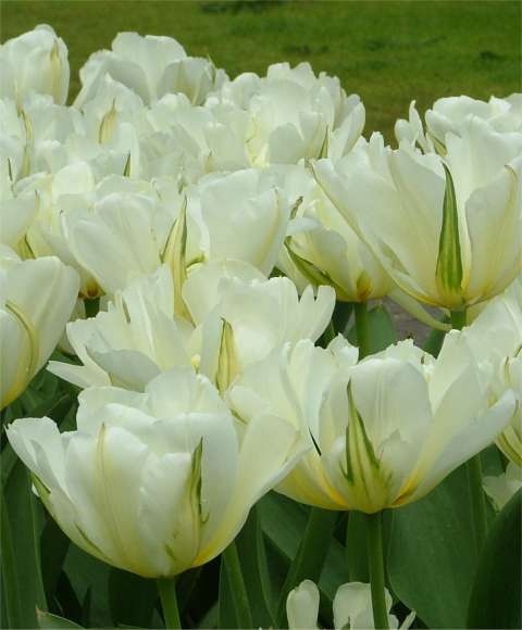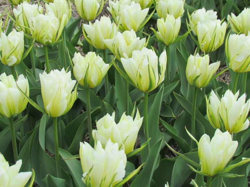 Kwiaty: pełne, duże (10–12 cm); kremowe z zielonymi żyłkami/płomieniami, wnętrze lekko żółtawe